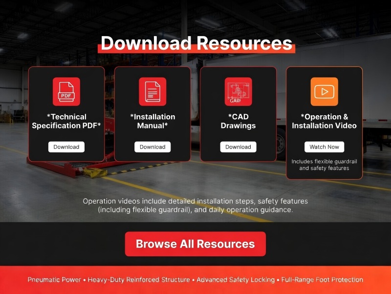 Safety is further enhanced with a full working-range foot guard (1.2mm thick), maintenance safety support bar, self-locking lip plate, and a smooth transition design that effectively prevents forklift impact damage.