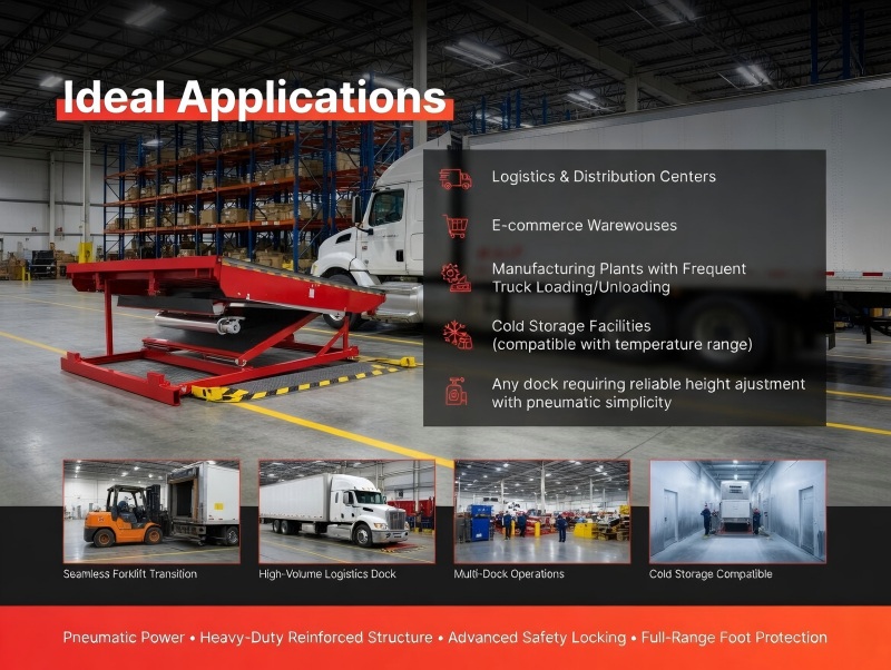 • Any dock requiring reliable height adjustment with pneumatic simplicity