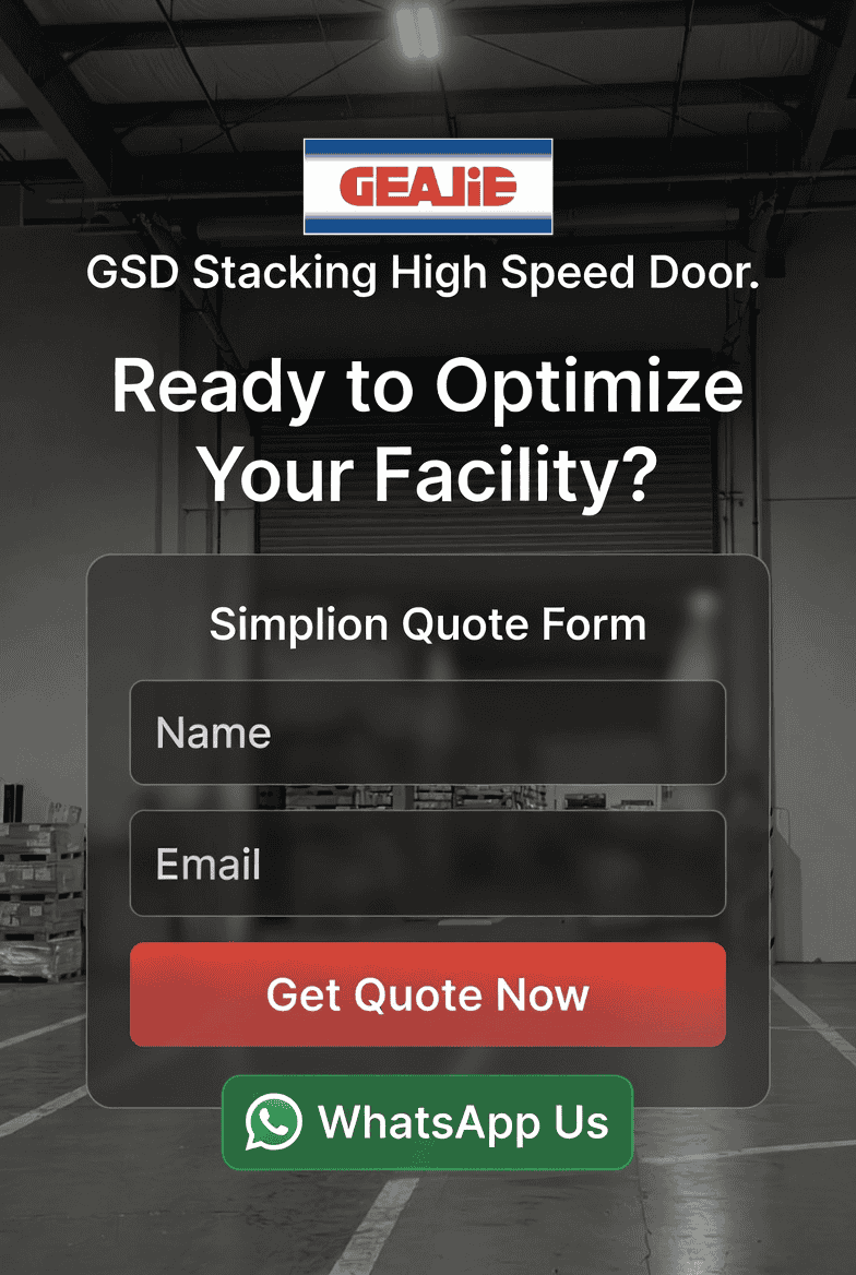 The GSD Industrial Fabric Stacking High Speed Door features a robust galvanized steel frame with powder coating. The 0.8mm high-strength fabric curtain with double-sided self-cleaning coating offers excellent durability, B2 fire resistance, and UV protection. The door stacks neatly upward, saving space and providing maximum clearance.
